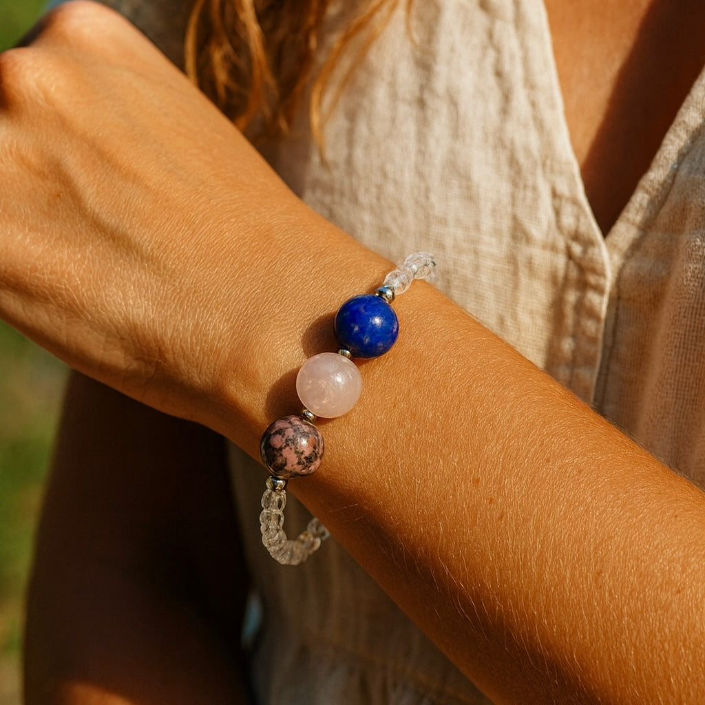 Our Self Acceptance Bracelet includes Lapis Lazuli, Rose Quartz, & Rhodonite stones on a stretch cord.